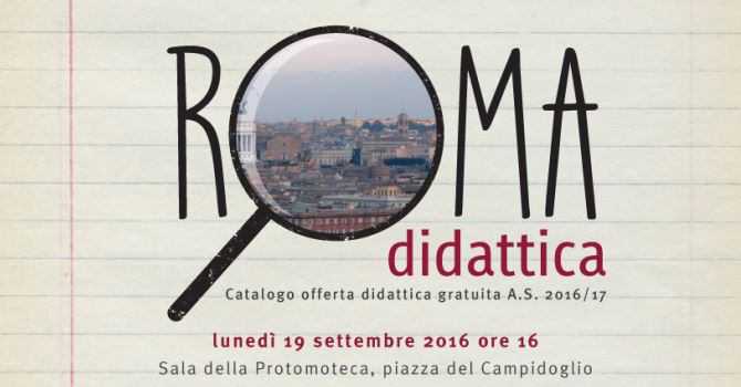 Il prossimo 19 settembre l'assessore alla Crescita culturale Luca Bergamo, l'assessore alla Persona, Scuola e Comunità solidale Laura Baldassarre, il Commissario per la gestione provvisoria dell'Istituzione "Sistema delle Biblioteche Culturali" Paola Gaglianone, il Sovrintendente Capitolino ai Beni Culturali Claudio Parisi Presicce sono lieti di invitare Dirigenti Scolastici, Docenti e Rappresentanti Scolastici di tutte le scuole di ogni ordine e grado di Roma e Provincia comprensiva alla presentazione di Roma didattica, Catalogo offerta didattica gratuita A.S. 2016/2017