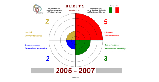 All'entrata di ogni museo, monumento, sito all'aperto, biblioteca, archivio, pubblico o privato aperto al pubblico, il simbolo HERITY, simile a un bersaglio, indica chiaramente e preliminarmente al visitatore per l'anno in corso il livello raggiunto da 1 a 5 relativamente ai 4 criteri seguenti: