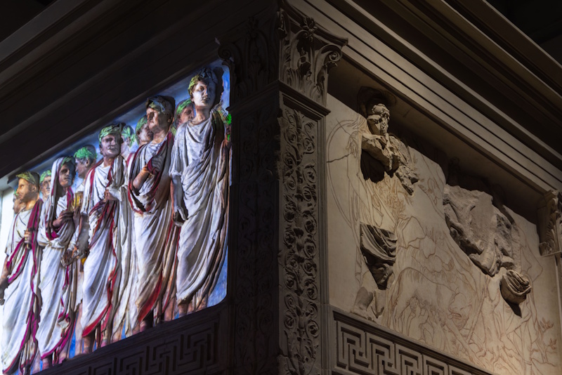 Sull’ipotesi della colorazione originaria dell’Ara Pacis ha lavorato negli anni passati un gruppo di studio nato in occasione dell’allestimento del nuovo Museo. In particolare, è stato approntato un modello tridimensionale dell’altare sul quale è stata applicata la restituzione del colore secondo criteri filologici e storico-stilistici. Dal modello è nata l’idea di proiettare direttamente sulle superfici in marmo dell’altare raggi di luce colorata per ricreare, in via d’ipotesi, l’aspetto totale e realistico prossimo alla policromia originaria.